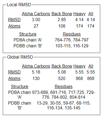 结构比对的结果可以用很多种参数来衡量,最常用的是root mean squared deviations(RMSD)。如果两个结构的RMSD为0埃,则结构一致,可以完全重合;一般来说RMSD小于3埃时,认为两个结构相似。