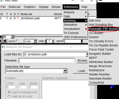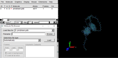 此时需要关闭VMD再重新打开,依次载入刚创建的jinrizhisen_autopsf.pdb文件和jinrizhisen_autopsf.psf文件。