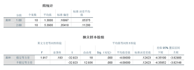 样本量为20(条锈菌与赤霉菌分别为10),条锈菌与赤霉菌的均数分别为1.3和5.39、标准差分别为0.17和0.35、标准误分别为0.05和0.11。 - 独立样本检验 若方差齐性假设(莱文方差等同性检验)满足,则读取第一行t检验的结果,否则读取第二行t检验的结果。 本例结果:经方差齐性检验得:F=1.917,P=0.183,可以认为方差齐同,读取第一行t检验的结果。t=-32.923,自由度=18,P=0.000,均数的差值为-4.09,标准误为0.124,均数差值的95% 置信区间为(-4.35,-3.83),差异有统计学意义。