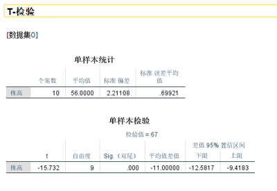 t=-15.73,自由度=9,P=0.000,样本均数与总体均数之差为-11.000,差值的95% 置信区间为(-12.5817,-9.4183),不包括0,差异有统计学意义。