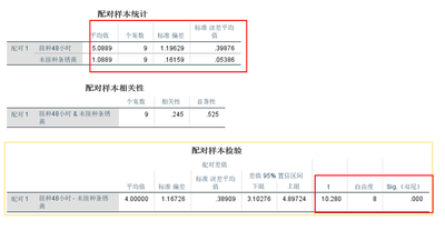 接菌-未接菌差值的均数为4.00,标准差为1.17,标准误为0.39,差值的95% 置信区间为(3.10,4.90),t=10.280,自由度=8,P=0.000,差异有统计学意义。