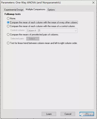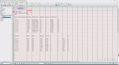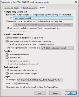 可以看到,分析结果有两部分。一部分为ANOVA结果;另一部分为Multiple comparisons结果。 那这两部分结果如何解读呢? 首先来看ANOVA分析结果。ANOVA分析首先假设各组平均值无显著性差异,但分析结果发现P<0.0001,拒绝原假设,结果表明各组平均值有显著性差异。ANOVA回答的问题到此为止。换句话说,ANOVA分析结果表明本次分析的5组实验均值之间有差异,但具体差异并不知道。 如果需要进一步了解详细差异,则需要查看多重比较结果。