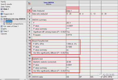 先看Brown-Forsythe test,其SD显著不同吗?回答是No,那意思就是相同的,即满足方差齐性。