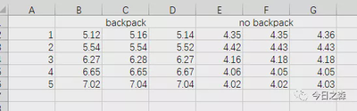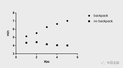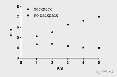 假设有两个我同时进行5公里跑步,一个背包,一个不背。并分别对每公里耗时进行计时,为了公平起见,我们请了3位计时员计时。比较背包与不背包对我每公里用时的影响。数据如下: