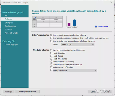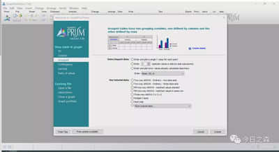打开软件,弹出一个欢迎框,其实很早之前我就打开过GraphPad Prism软件,但每次一打开就弹出这个界面,然后我就无从下手了,不知道下一步要怎么办,于是,打开了很多,很多次又把它关闭了。