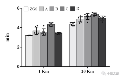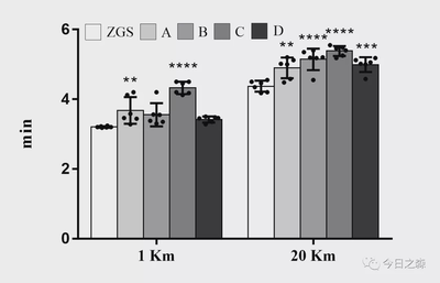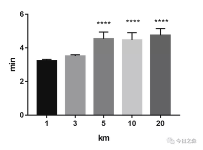 这样很明显可以看到各组之间的差异,下面我们根据统计结果在图中添加*,这里需要添加的*很多,看起来也很不直观,演示起来也比较麻烦。为了演示方便起见,我们更改一下刚才的统计策略,我们让各组数据都和1km的配速进行比较。