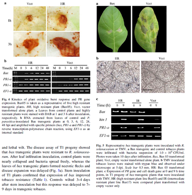 其中有研究表明,由携带bax的病毒载体诱导的植物细胞死亡和携带N基因的烟草植物中有烟草花叶病毒(Tobacco mosaic virus,TMV)诱导的坏死表型非常相似。即:BAX靶向线粒体,并将线粒体的形状从杆状变为圆形;叶绿体膜被破坏,并导致其内容物泄露;液泡被破坏;BAX异源表达还引发局部PCD,并诱导植物防御基因的表达,诱导与系统获得性(systemic acquired resistance,SAR)相关的一些基因。
