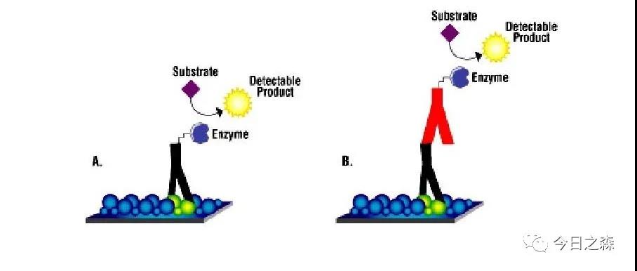 孵育后的带有酶(碱性磷酸酶、辣根过氧化物酶)标记的二抗(也是俗称的酶标二抗)与一抗结合形成抗体复合物,至此可用来指示一抗的位置,