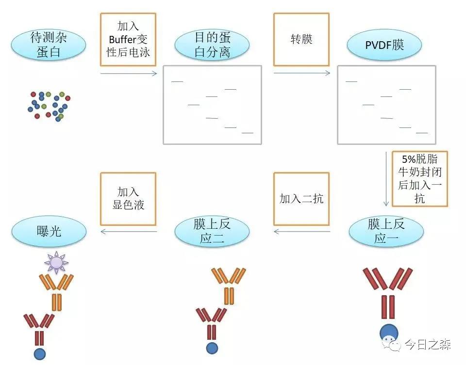 经过PAGE(聚丙烯酰胺凝胶电泳)分离的蛋白质样品,转移到固相载体PVDF或NC膜上,固相载体以非共价键形式吸附蛋白质,