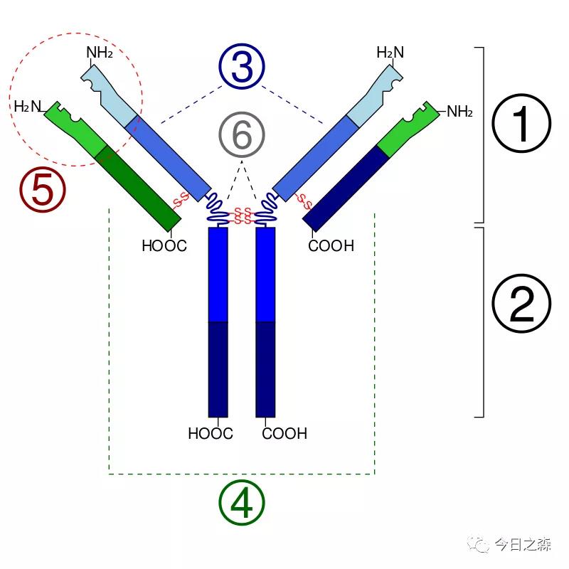 蓝色的重链有一个可变区(VH),紧随其后的一个恒定区(CH1),一个枢纽区,以及另两个恒定区(CH2 and CH3)组成
